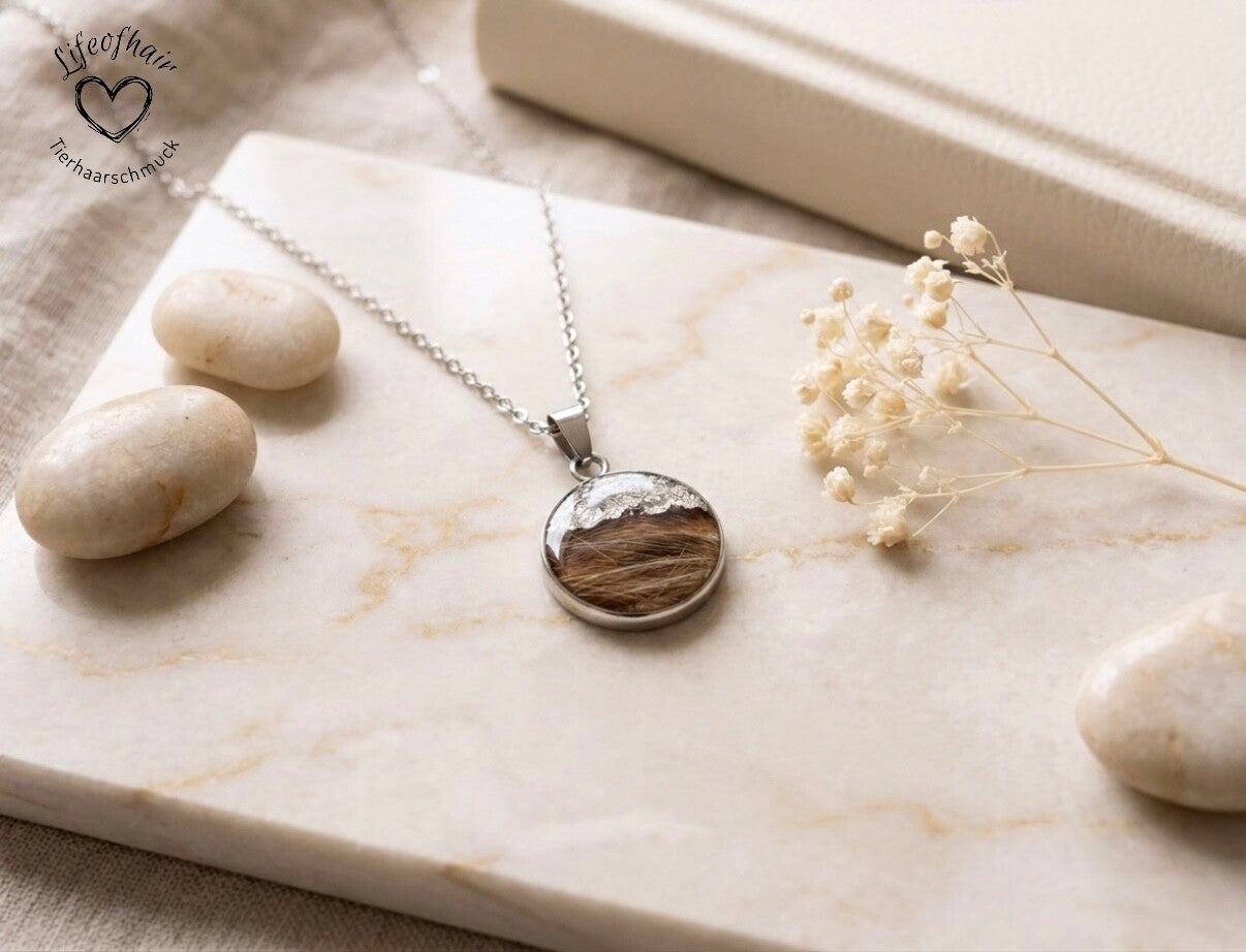 In dieser handgefertigten Halskette werden Fell- oder Schweifhaare deines Lieblings zu einem einzigartigen Schmuckstück verarbeitet.